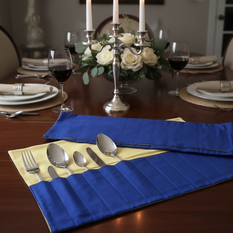 De bestekhoezen zijn te koop in de kleuren donkerblauw, donkergroen, koningsblauw, kersenrood en zwart.