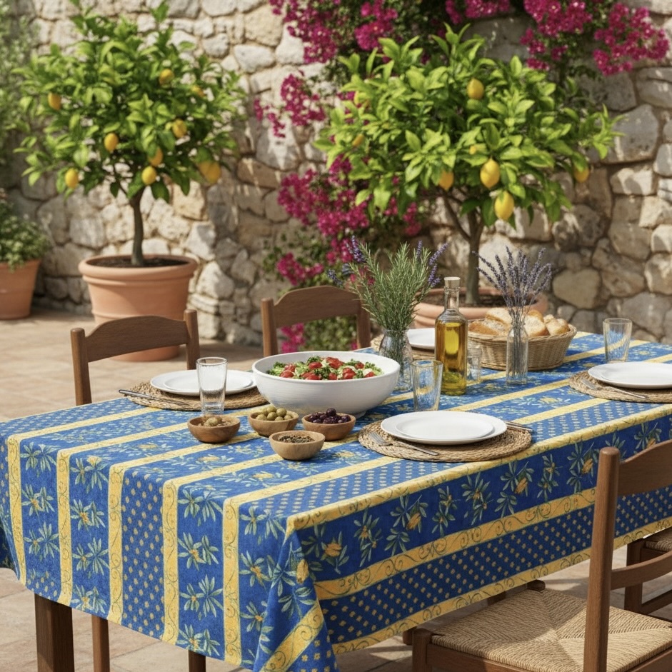 Placemat Cigales blauw kunt u alleen bestellen in katoen, dus zonder coating. Deze Franse placemat kunt u binnen en buiten gebruiken.