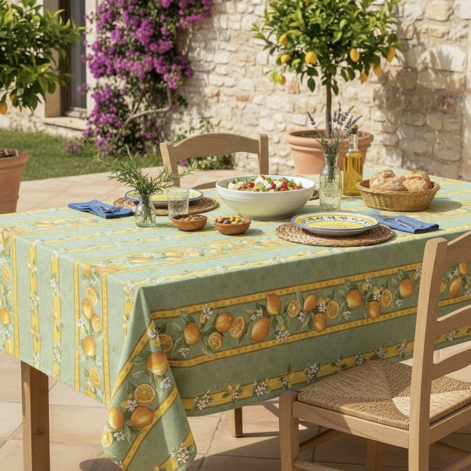 Placemat Citroentjes uit Menton groen kunt u alleen bestellen in katoen, dus zonder coating. Deze Franse placemat kunt u binnen en buiten gebruiken.