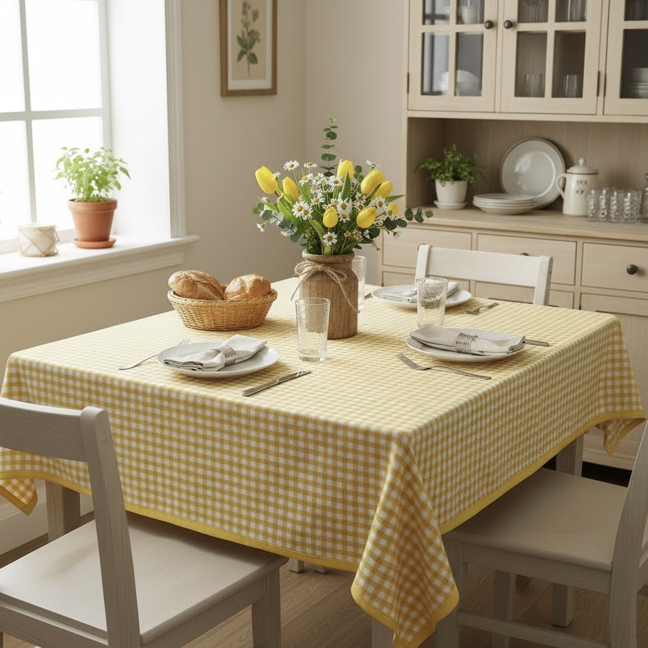 Rond 140, 180, 200 cm. tafelkleed gele ruit.