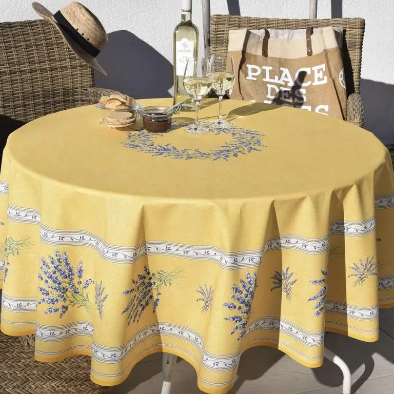 Rond tuintafelkleed Lavendel geel 175 180 rond, leuk ook voor Pasen, is door Bellebien voor u uit de Zuid-Franse Provence geïmporteerd.
