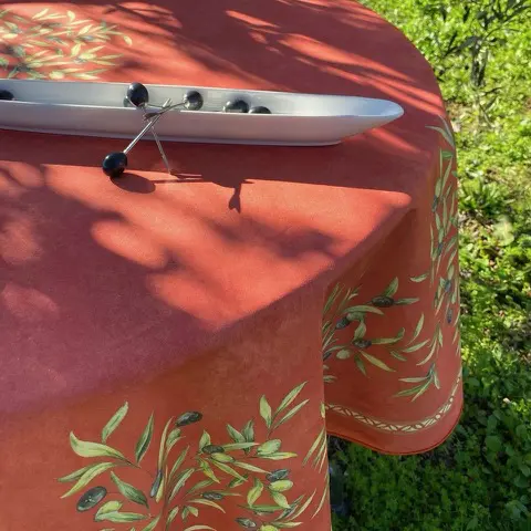 U kunt het ronde Franse tafelkleed Oliviers terra bestellen in de maten 175 cm. rond (gecoat) en 180 cm. rond (katoen).