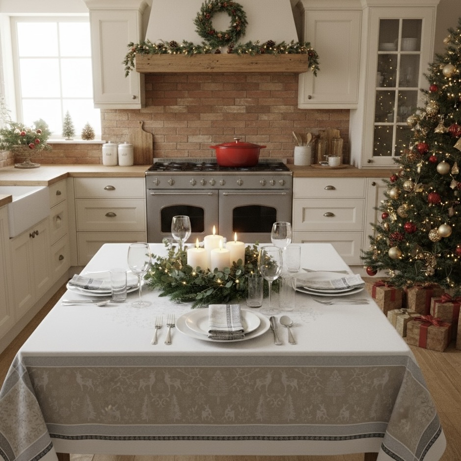 Kerst tafelkleed Chamonix lin is een kwalitatief prachtig tafelkleed met een rand van geweven kerstmotieven.