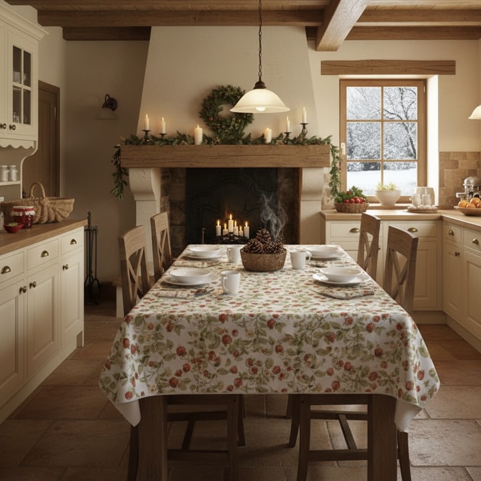 Frans tafelkleed Aardbeien rood kunt u bestellen in de maten 150×200, 150×250, 150×300 en 160 rond.