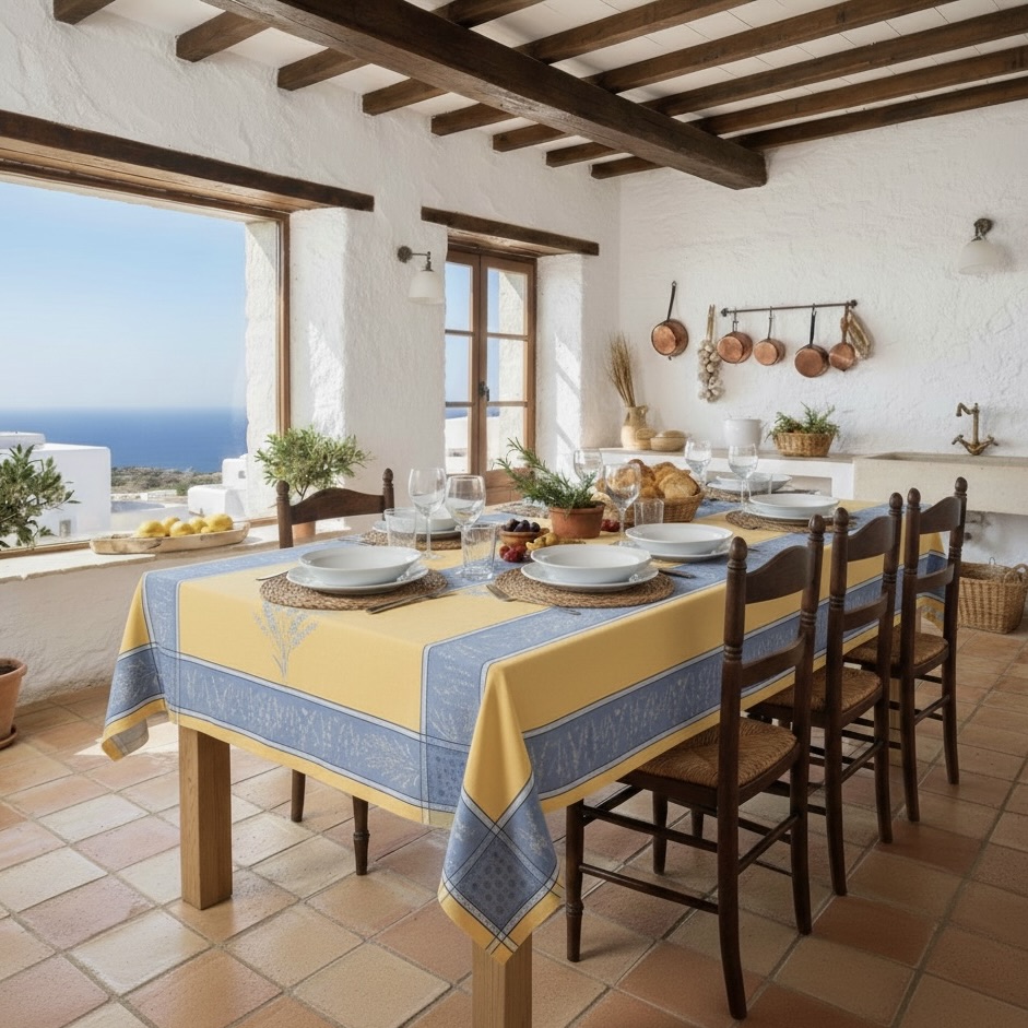 Frans tafelkleed Jacquard Lavandes blauw geel kunt bestellen in de maten 160×200, 160×250 en extra lang 160×350 cm.