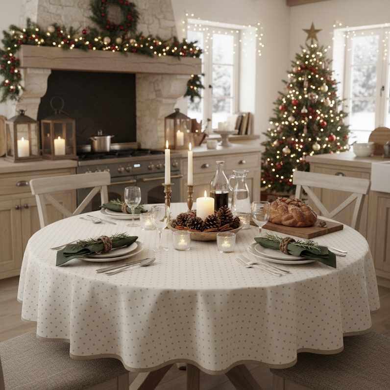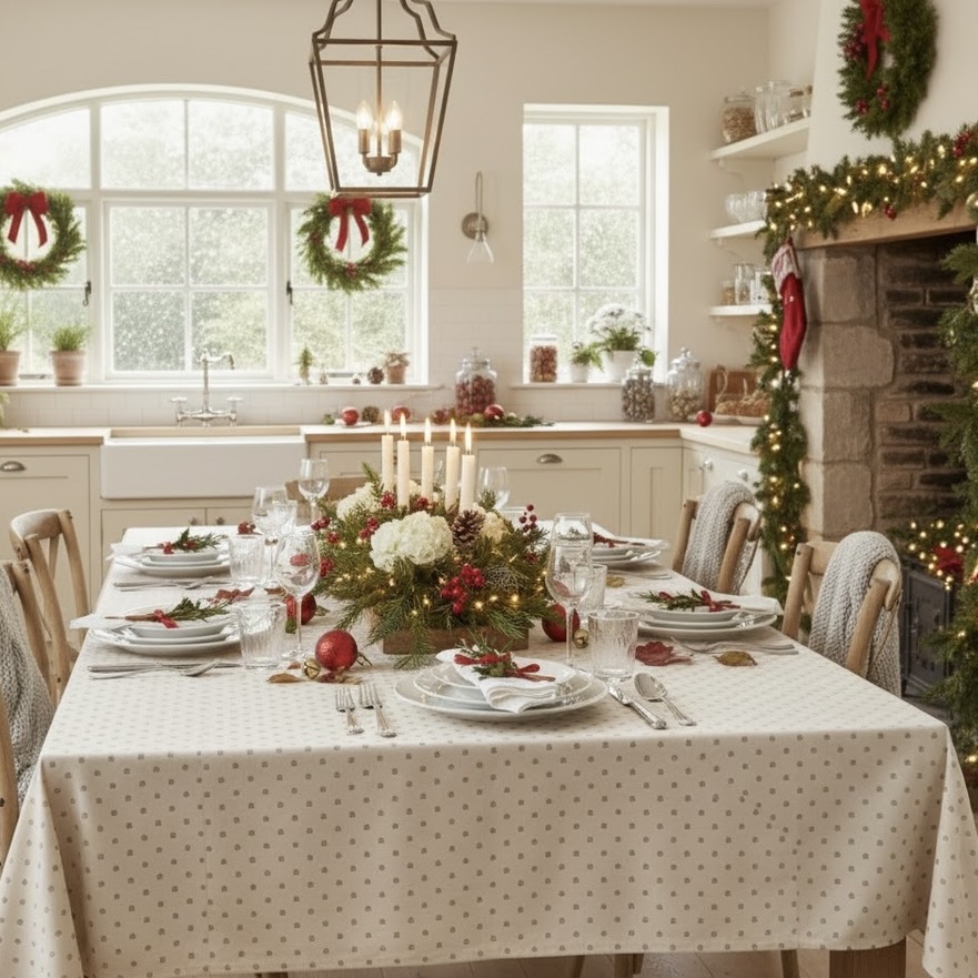 Dit tafelkleed combineert mooi met een roomwit servies, bijvoorbeeld met Wedgwood Edme.