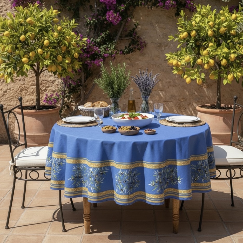 Frans tafelkleed Rameaux d’Oliviers lavendelblauw kunt u bestellen in de maten 150×200, 150×250 en 180 rond.