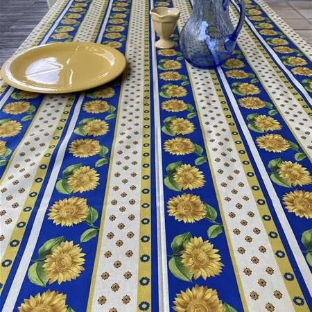 Frans tafelkleed Zonnebloem blauw kunt u bestellen in de maten 175 cm. rond gecoat en 180 rond zonder coating.