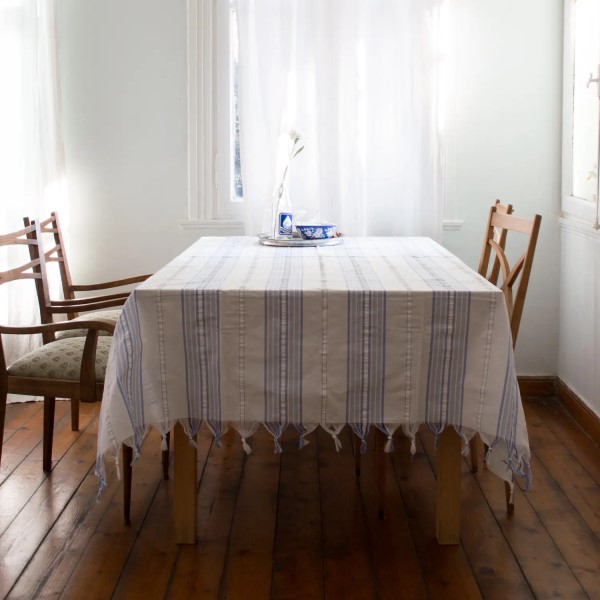 Dit tafelkleed heeft geribbelde strepen en franje, het is gemaakt van fijne katoen.