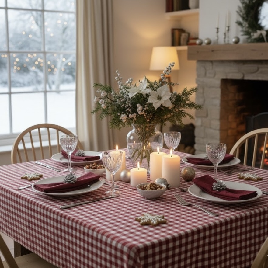 Vierkant tafelkleed 160x160 cm. rood wit geruit gecoat Bellebien wintersfeer