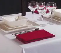 De restant damasten servetten zijn zoveel mogelijk gesorteerd op kleur, afmeting en breedte van de zoom.