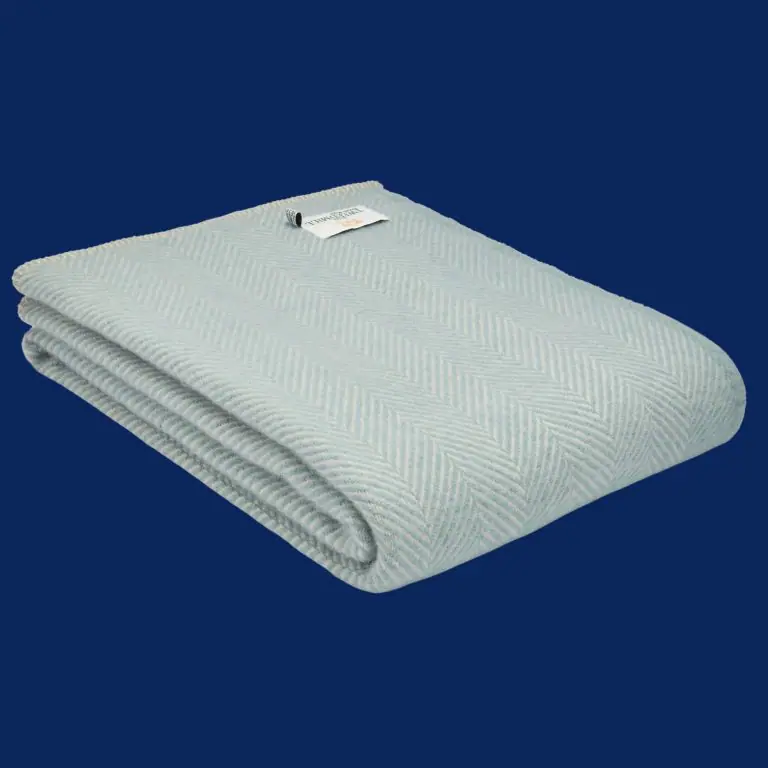 Plaid Blanket Stich Fishbone Duck Egg is gemaakt van 100% wol en kan op een wolwasprogramma op 20-30° worden gewassen.