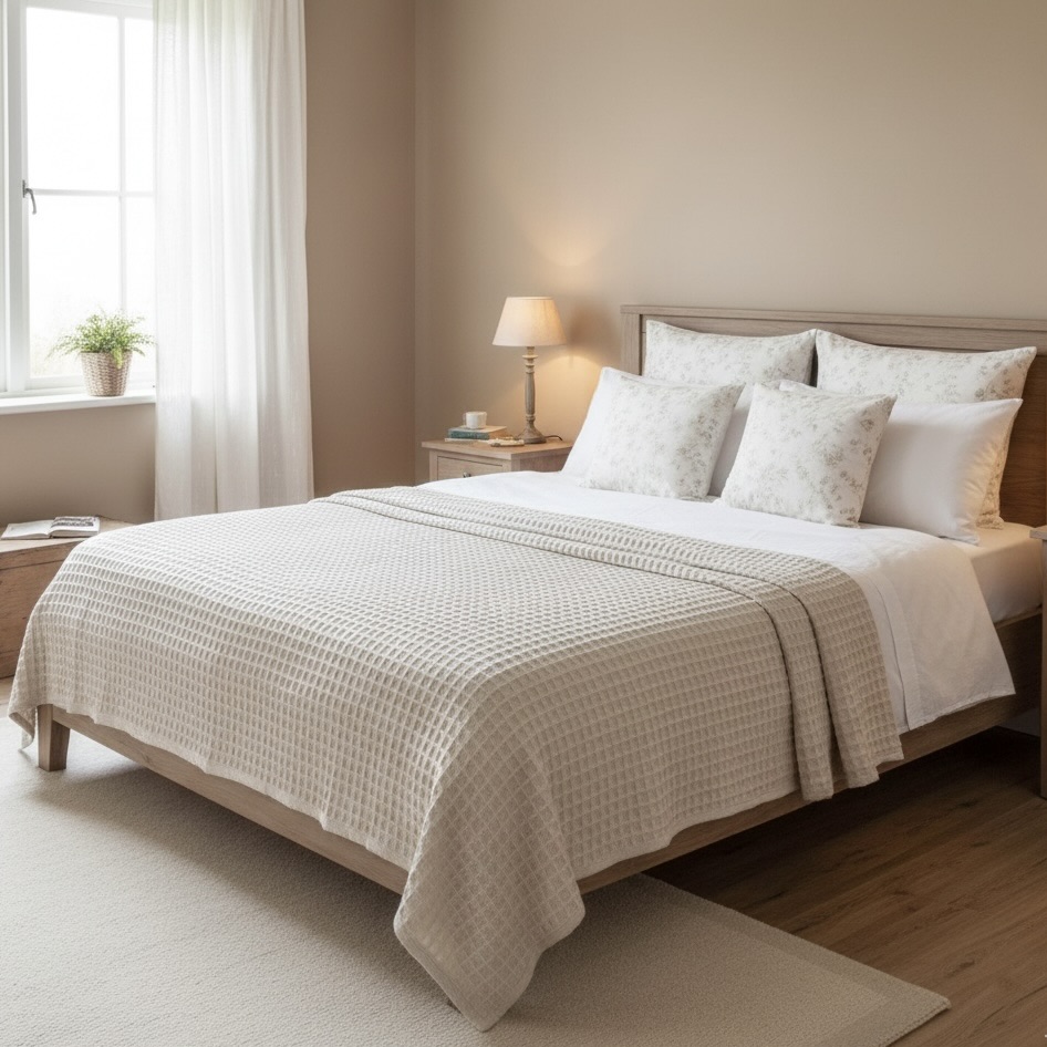 Wafeldeken zand, beige, 1 en 2-persoons van Bellebien is heerlijk koel om onder te slapen in de zomer.